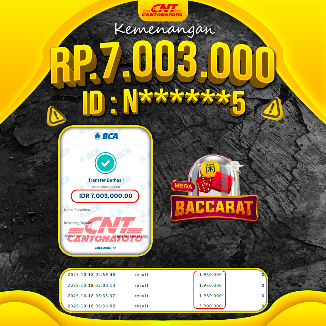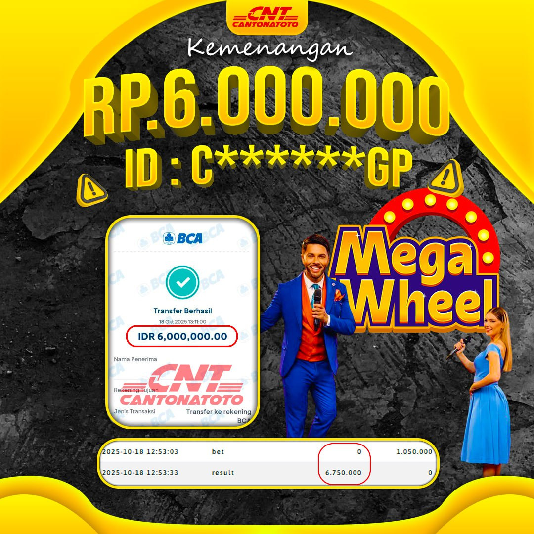 CUMA MOD4L R3C3H HASILNYA TIDAK MASUK AKAL???? MAIN SANTAI AJA, REZEKI BISA DATANG TIBA-TIBA???? YUK COBAIN JUGA , BIAT KAMU NGERASAIN SENSASINYA!!! ❤️SEL4M4T KEPADA M3MB3R S3TIA CANTONATOTO ????TANGGAL : 18 OKTOBER 2025 ????USER ID : C*******P ????B0 : CNTT ????M3N4NG : MEGA WHEEL ????RP. 6.000.000